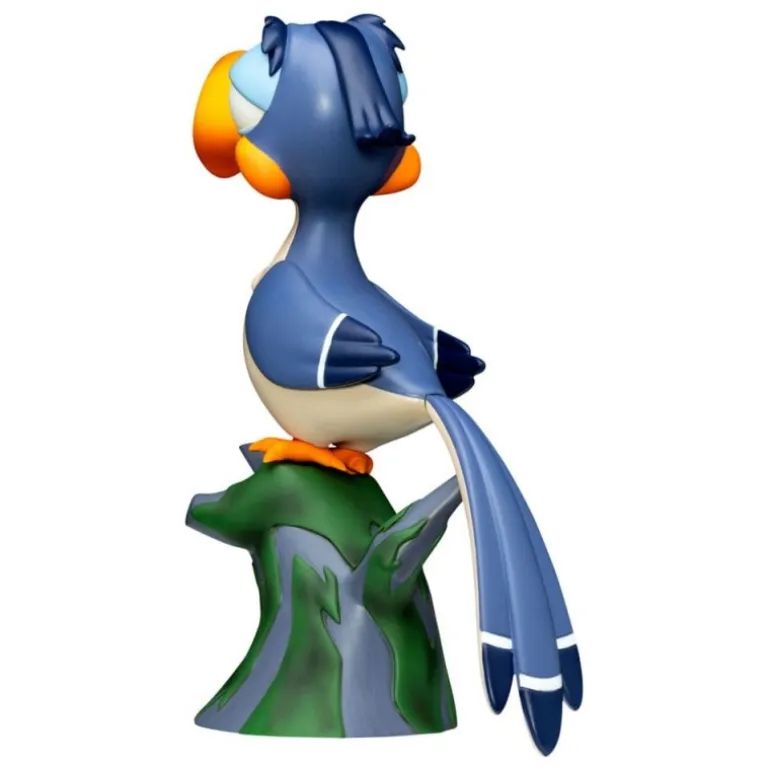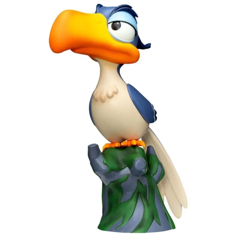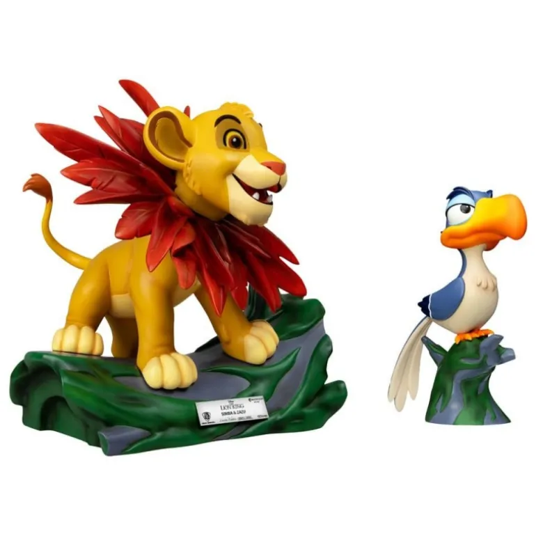 Simba, con su pelaje dorado y detalles rojos en la melena, está cuidadosamente posicionado sobre una base que representa la sabana africana. Zazu, con su distintivo pico naranja y plumaje azul, está representado con una expresión característica, de pie sobre una base en forma de tronco.