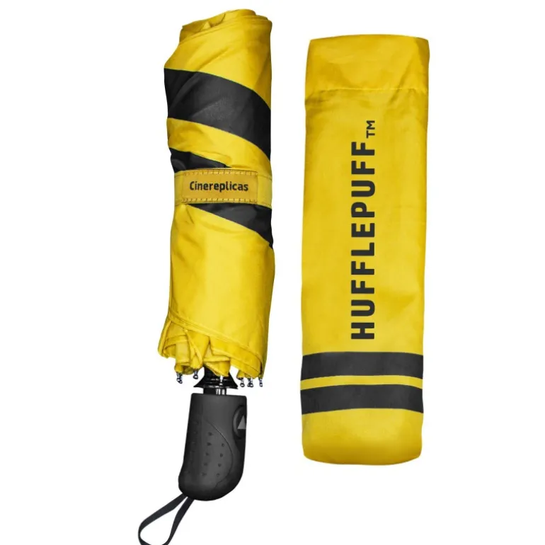 Además el diseño es absolutamente fantástico. Sobre un llamativo y elegante color amarillo tienes el escudo de la casa Hufflepuff del colegio de magia y hechicería Hogwarts, con sus dos características bandas negras bordeando el paraguas.
