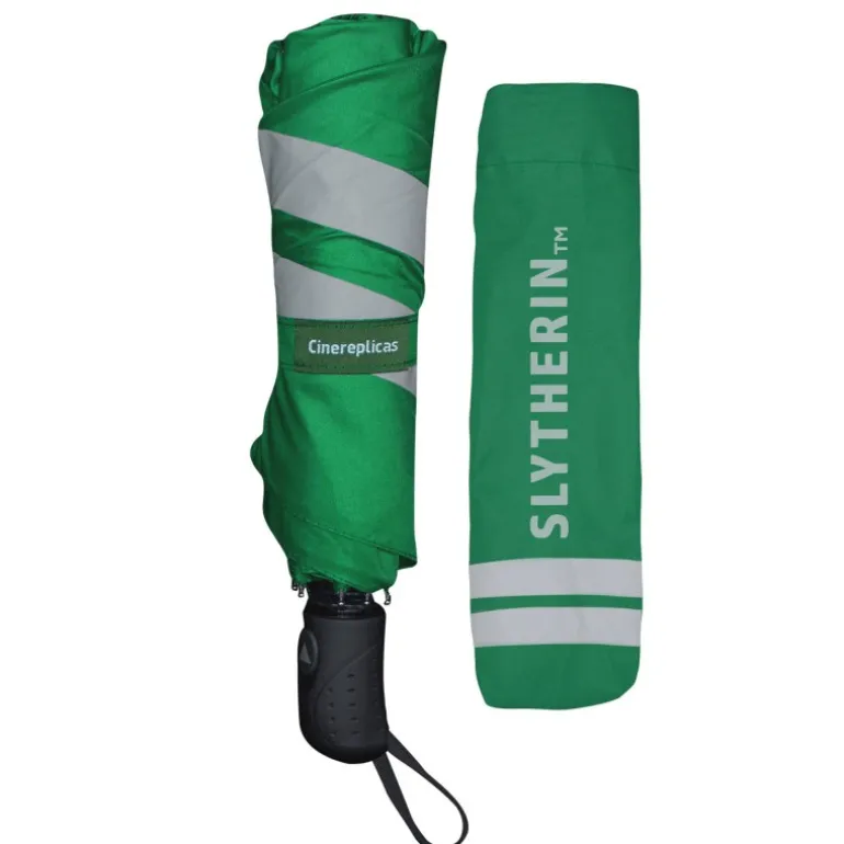 Además el diseño es absolutamente fantástico. Sobre un discreto y elegante color verde tienes el escudo de la casa Slytherin del colegio de magia y hechicería Hogwarts, con sus dos características bandas grises bordeando el paraguas.