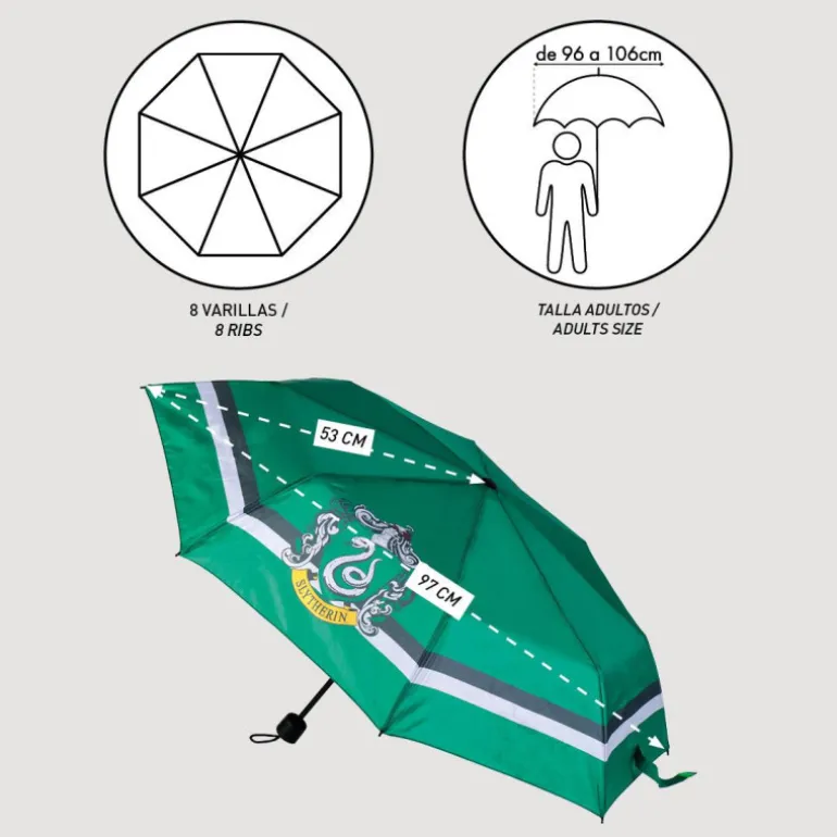 Además el diseño es absolutamente fantástico. Sobre un discreto y elegante color verde tienes el escudo de la casa Slytherin del colegio de magia y hechicería Hogwarts, con sus dos características bandas grises bordeando el paraguas.