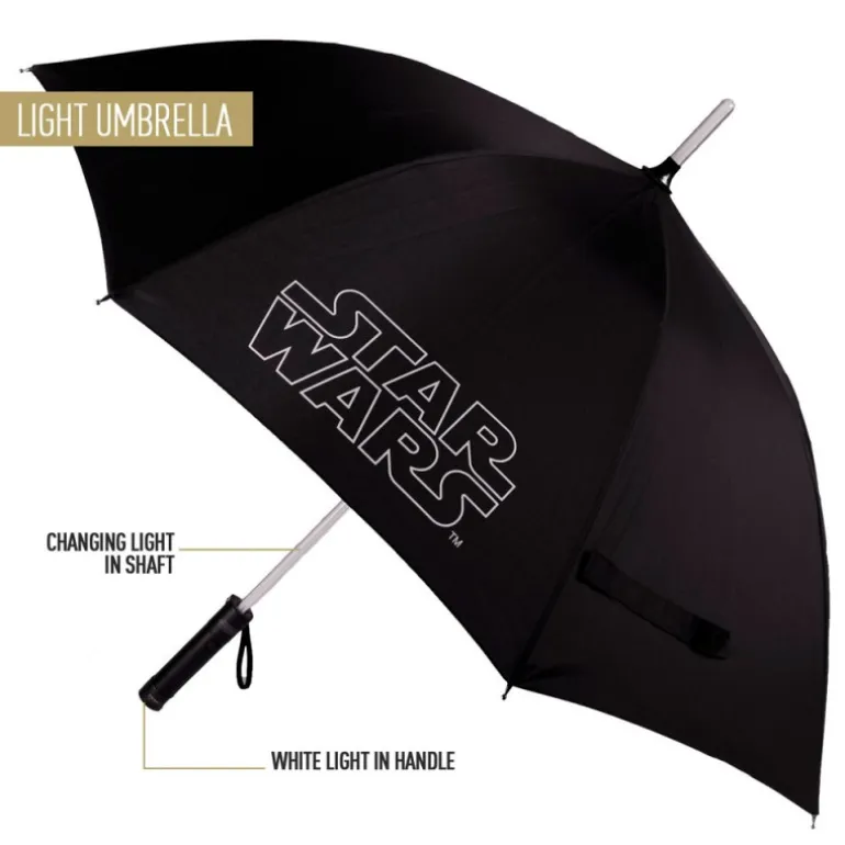 Realizado en poliéster de gran calidad el paraguas tiene unas dimensiones 93 cm y una extraordinaria calidad tanto en acabados como en los materiales y el diseño gráfico con el logo en un poderoso dorado, y lo más importante es que se ilumina! Cada vez que lo enciendes el paraguas cambiará el color de rojo, azul o verde, según te vayas acercando al lado oscuro! Además en uno de sus extremos tiene una potente linterna LED que seguro te sacará de un apuro más de una vez. Funciona con pilas incluídas.