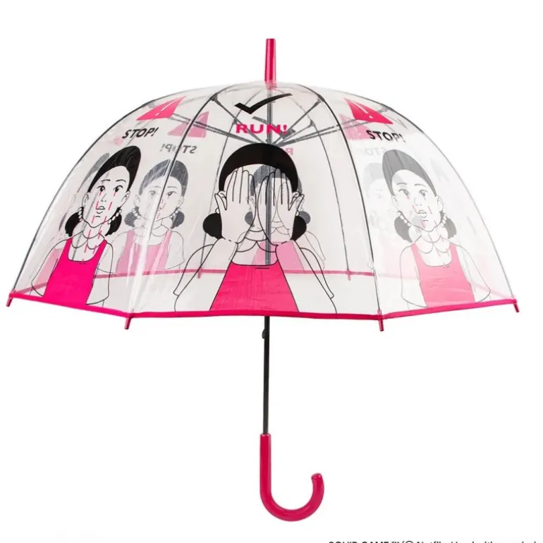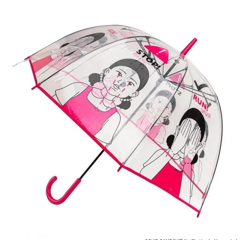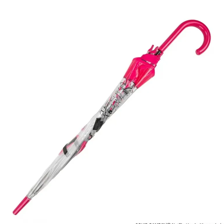 Descubre el Paraguas Transparente Squid Game, un accesorio único para los seguidores de la serie. Fabricado con material transparente de alta calidad, este paraguas destaca por sus vibrantes ilustraciones en tonos rosa y negro inspiradas en la emblemática muñeca del juego. Con dimensiones de 83cm x 11cm x 4,5cm, proporciona una cobertura amplia mientras mantiene un diseño compacto y fácil de llevar. Su mango curvado en color fucsia añade un toque moderno y permite un agarre cómodo. Perfecto como artículo de colección o como regalo para auténticos entusiastas del fenómeno El Juego del Calamar.
