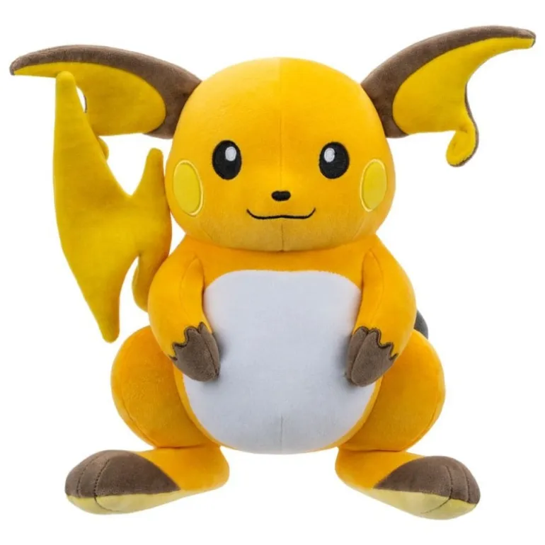 Con un vibrante color amarillo que refleja fielmente la apariencia de Raichu, el peluche está cuidadosamente diseñado con orejas marrones y cola amarilla, detalles que lo hacen irresistible. Las mejillas y el vientre blancos contrastan perfectamente, dándole un aspecto encantador.