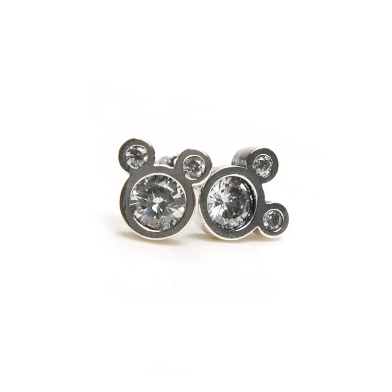 Unos pendientes muy elegantes que tienen la forma característica de la cabeza de Mickey, con esas orejitas inconfundibles que son todo un icono de Disney. Miden en torno a 10 x 10 mm y son aptos para orejas perforadas. Tanto el pendiente como la tuerca Están fabricados en Plata de Ley, y en el centro tienen circonitas brillantes, en una combinación realmente acertada.
