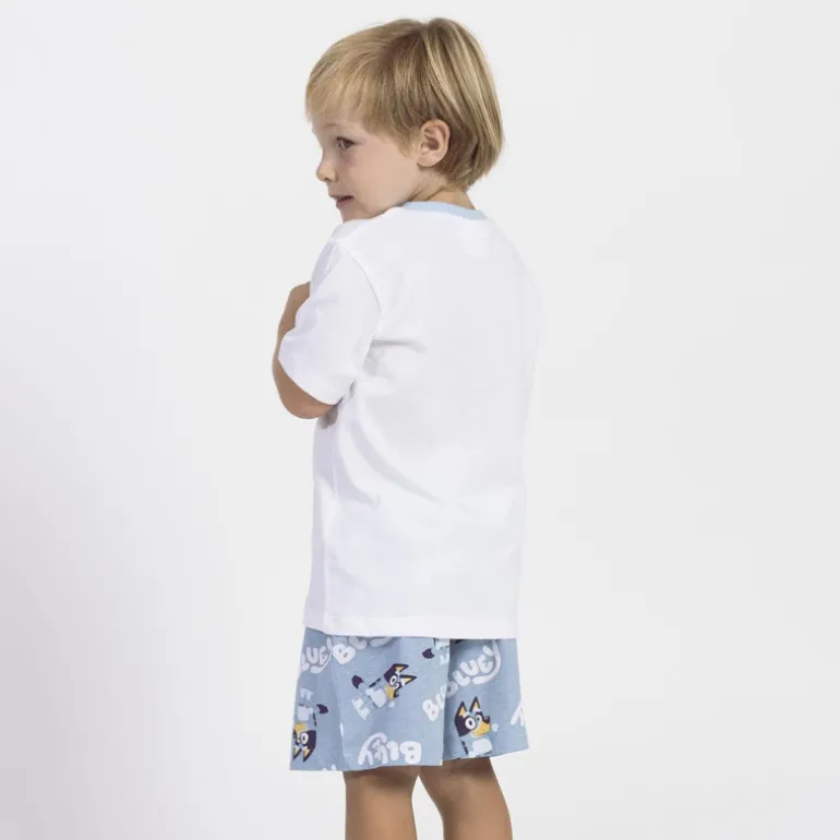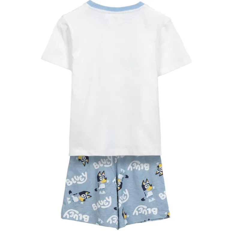 Descubre el encantador pijama corto inspirado en Bluey, ideal para los más pequeños de la casa. Este conjunto incluye una camiseta blanca con un llamativo estampado del querido personaje Bluey al frente, acompañado del logo en tonos suaves. Los pantalones cortos presentan un patrón repetido del personaje en un vibrante color azul claro, ideal para añadir un toque de diversión a la hora de dormir.