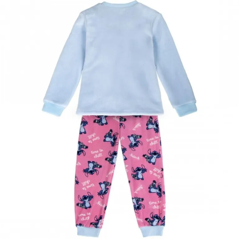 Este encantador pijama largo de coral fleece está diseñado especialmente para los pequeños fans de Stitch de entre 6 y 14 años. Confeccionado en suave 100% poliéster, proporciona una comodidad extraordinaria durante el descanso. La camiseta azul claro destaca por su adorable imagen de Stitch, acompañado de la frase ‘time to chill’, que invita a relajarse. Los pantalones rosas llevan un diseño integral con imágenes repetidas de Stitch en diferentes posiciones, complementando perfectamente el look lúdico del conjunto.