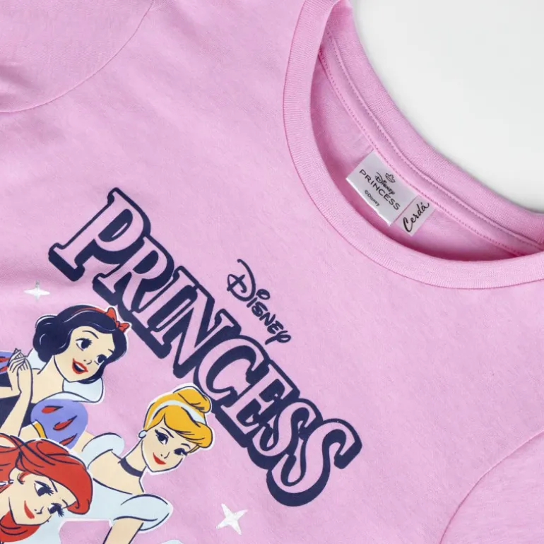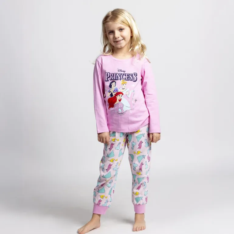 El diseño incluye una camiseta de manga larga en un delicado tono rosa, adornada con un motivo de las amadas princesas Disney. La parte frontal muestra a varias princesas icónicas, destacando su elegancia y magia características. Los pantalones son igual de encantadores, presentando un patrón repetido de pequeñas princesas en diferentes poses y colores, sobre un fondo también rosado.
