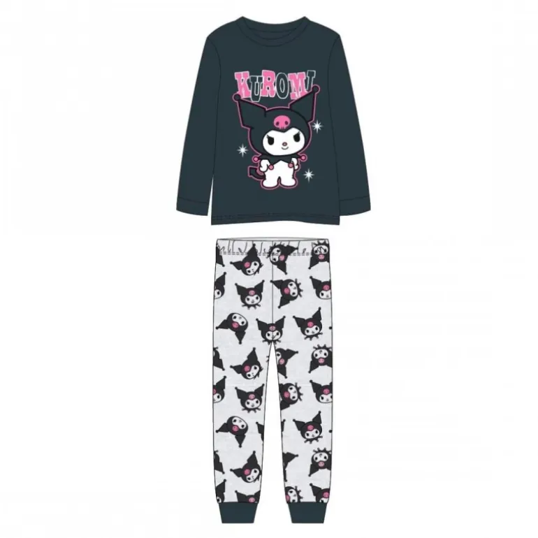 El conjunto incluye una camiseta de manga larga en color oscuro con la adorable imagen de Kuromi y detalles en rosa y blanco, complementado por unos pantalones claros con estampado repetido del personaje Kuromi. Disponible en tallas para niñas de 6 a 14 años, este pijama es ideal para las fans de Hello Kitty que desean llevar su personaje favorito también en casa.