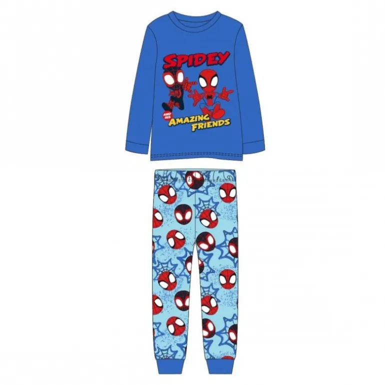 Este encantador pijama largo de Spidey está diseñado para los pequeños héroes de entre 3 y 6 años. Confeccionado en una suave mezcla de 60% algodón y 40% poliéster, garantiza comodidad y resistencia. La camiseta de manga larga presenta un vibrante color azul con el texto ‘Spidey Amazing Friends’ y una imagen de Spidey en acción, mientras que el pantalón luce múltiples caras de Spidey sobre un fondo azul claro con redes de araña como detalles. Perfecto para mantener a tu pequeño cómodo y abrigado durante las noches.