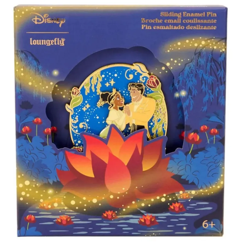 Este encantador pin de edición limitada de 1,600 unidades presenta un diseño inspirado en la mágica película «La Princesa y el Sapo» de Disney. Dentro de una caja elegante, decorada con un vibrante fondo azul y detalles de hojas y flores de nenúfar en tonos rojos y anaranjados, destaca un pin esmaltado deslizante que muestra a los personajes protagonistas bailando bajo un cielo estrellado.