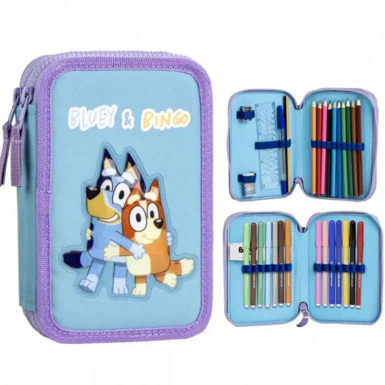 Este encantador plumier Bluey es perfecto para los pequeños amantes de la creatividad. Con un acabado en color azul claro y detalles en lila, presenta un diseño vibrante con Bluey y Bingo abrazados en la tapa frontal. Dentro, encontrarás todo lo necesario para la escuela: una completa selección de lápices de colores, rotuladores, regla, sacapuntas, y borrador, todo organizado en un elegante estuche hecho de 90% poliéster y 10% PVC. Sus prácticos compartimentos aseguran que cada elemento esté en su lugar, promoviendo la organización y el orden. Ideal para llevar a clase o usar en casa, este plumier no solo es funcional, sino también un accesorio de moda para los pequeños admiradores de Bluey.
