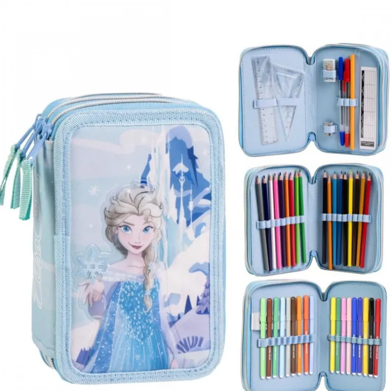 Descubre el encantador plumier con accesorios Giotto Frozen, un estuche portatodos ideal para los pequeños aficionados al mágico mundo de Frozen. Confeccionado en 100% poliéster, este práctico y resistente plumier presenta un diseño vibrante con tonalidades azul oscuro y detalles delicados, destacando la figura de Elsa en la portada. Al abrir el estuche, encontrarás un mundo de color que incluye lápices, rotuladores y otros útiles escolares esenciales dispuestos de manera ordenada y accesible.