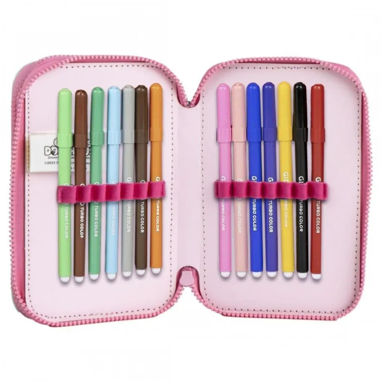 Al abrirlo, encontrarás tres compartimentos repletos de útiles escolares. Incluye lápices de colores, rotuladores, una regla, un sacapuntas y una goma de borrar. Cada accesorio está organizado de manera que resulte fácil de sacar y guardar. Este estuche tiene la capacidad perfecta para mantener a los pequeños creativos organizados y ocupados durante horas.