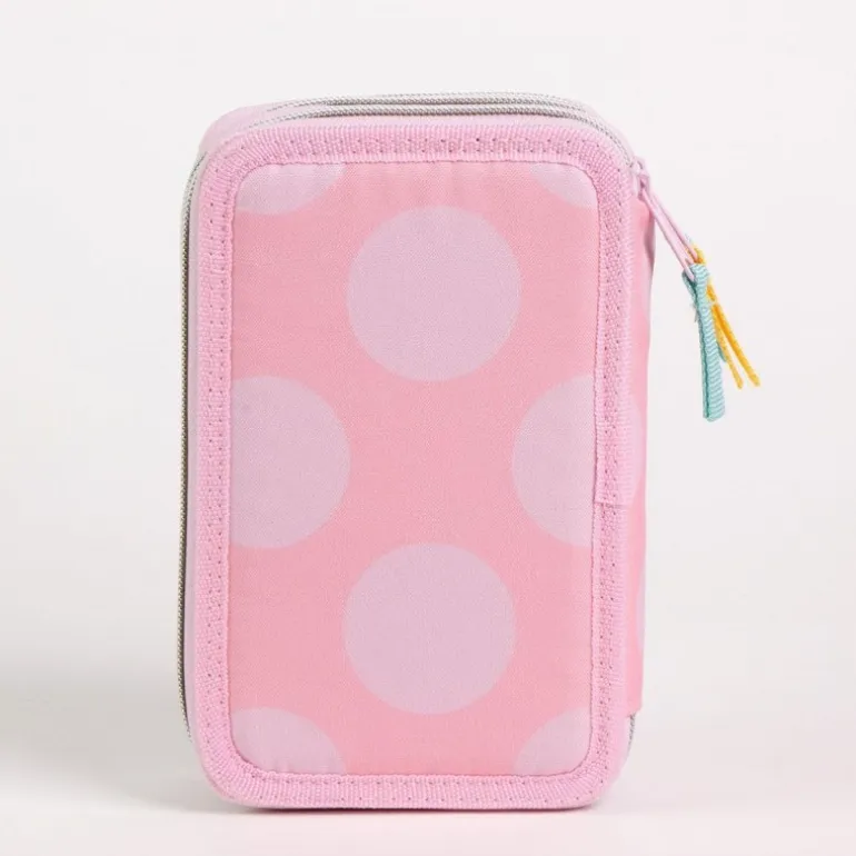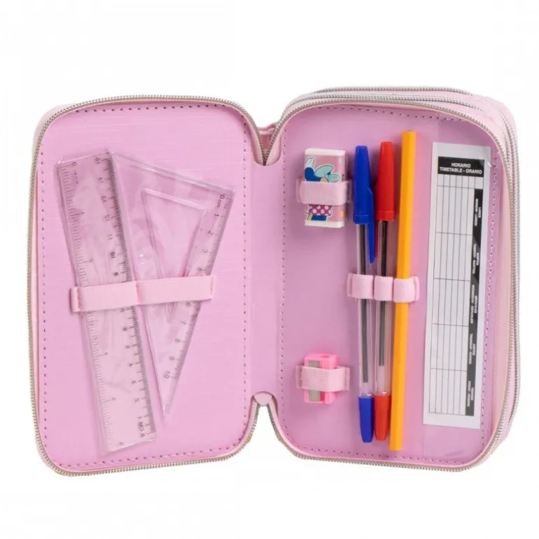 Dentro, encontrarás una amplia variedad de accesorios escolares: lápices de colores, rotuladores, reglas, goma y sacapuntas, todo organizado para facilitar el acceso y mantener el orden. El interior es de un suave rosa que complementa a la perfección el diseño exterior, presentando a Minnie en una alegre pose. Este plumier no solo es funcional, sino también un accesorio encantador que inspirará la creatividad de los niños, haciendo del aprendizaje una experiencia divertida y atractiva.
