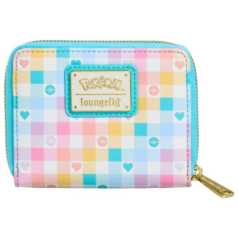Este monedero de alta calidad de la colección Pokemon by Loungefly es ideal para los fans de los entrañables personajes Piplup y Eevee. Con un diseño encantador, en el frente se encuentran Piplup y Eevee sobre un fondo de cuadros en tonos pastel y rosa con pequeños detalles de pokebolas y corazones.