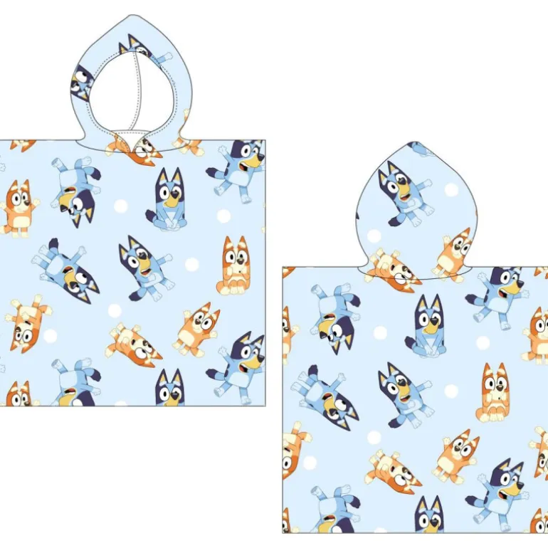 El diseño en **tonos azules claros** presenta a los adorables personajes de **Bluey**, lo que atraerá la atención de los niños y los hará sentir parte de sus aventuras favoritas. Con un fondo azul decorado con divertidos estampados de los personajes, este poncho no solo es cómodo, sino también visualmente atractivo.