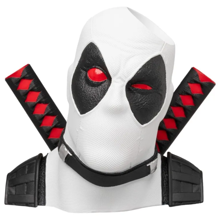 El diseño en 3D muestra la cabeza de Deadpool en blanco con detalles en negro y rojo, resaltando su característica máscara. La escultura también incluye dos katanas cruzadas detrás de la cabeza, cada una con detalles negros y rojos, aportando un toque único y llamativo.