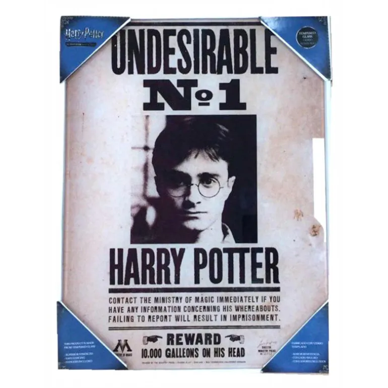 Sus medidas son aproximadamente 30 x 40 cm e incluye un sistema de sujeción que te permitirá fijarlo a la pared de manera discreta. Tanto la calidad de materiales como el diseño son extraordinarias, ya que está está impreso directamente sobre el vidrio, consiguiendo unos colores vivos y brillantes. Pero lo mejor es la imagen en sí que reproduce, que nos muestra ese mítico cartel que señala a Harry como Indeseable Nº1.