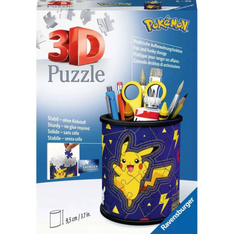 Se trata de un puzzle de la famosa firma especializada Ravensburger, con piezas de plástico de alta calidad, que se ensamblan a la perfección para construir un bote portalápices que te será muy útil en tu escritorio. Una vez lo montes, tendrás un portalápices que mide aproximadamente 9,5 cm de alto, que además tiene una imagen protagonizada por siempre alegre y adorable Pikachu, la criatura más icónica de Pokémon.