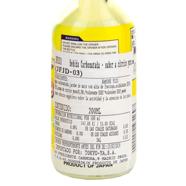 Ingredientes: Agua carbonatada, jarabe de maiz con alta de fructosa, acidulante E330, aroma de cítrico yuzu 0,1%, colorantes E102