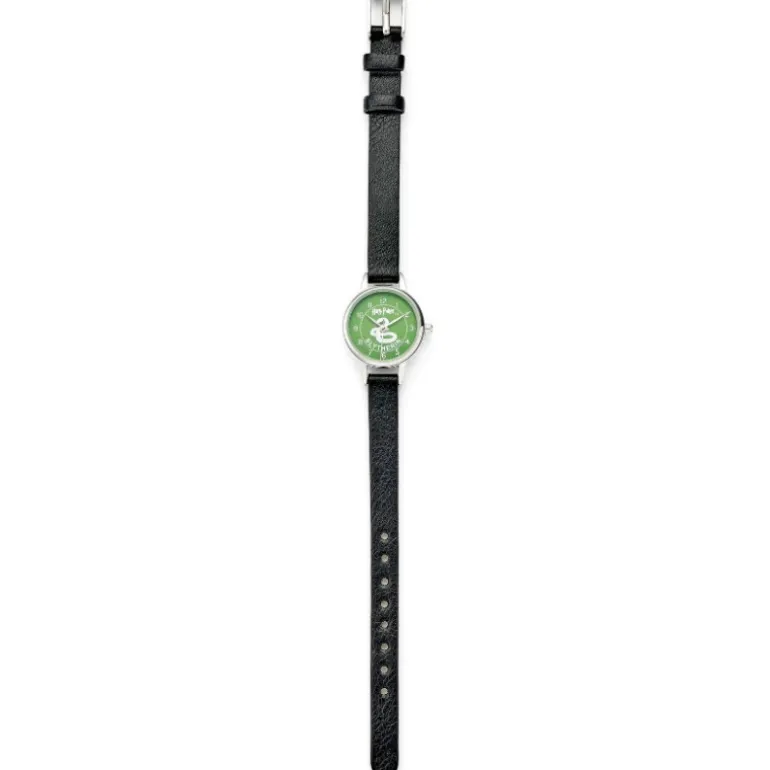 Se trata de un reloj muy elegante, y con un diseño absolutamente genial, inspirado en la Casa Slytherin, una de las cuatro que integran el famoso Colegio Hogwarts, con la esfera en color verde y la silueta de la serpiente que representa a la casa. La correa es fina y está fabricada en cuero sintético, ideal para muñecas pequeñas. Viene en una cajita con una presentación excepcional, casi tan elegante como el propio reloj.
