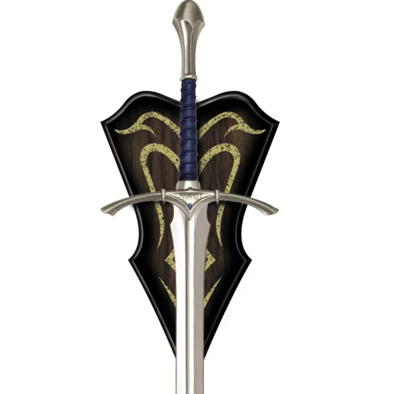 Esta réplica a escala 1/1 de la Espada Glamdring de Gandalf es un imprescindible para cualquier coleccionista de El Señor de los Anillos. Con una longitud aproximada de 121 cm, esta pieza destaca por su hoja de acero inoxidable y su mango envuelto en cuero, lo que le confiere un acabado elegante y realista.