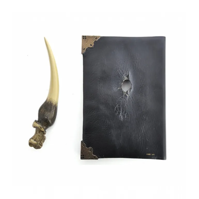 Esta réplica del Diario de Tom Riddle de unos 23cm de altura e incluye también el colmillo del basilisco que usa Harry Potter contra él. Además es una pieza independiente que podrás extraer para ver el agujero que ha dejado en el diario.