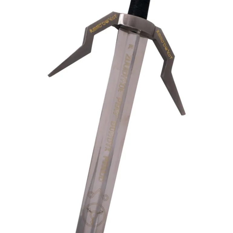Fíjate en su preciosa empuñadura con dos cabezas de lobo entrelazandose. Además tiene una larga empuñadura, ya que es a dos manos, con un ornamento que quedaría a la vista aunque la tengas sujeta y las guardas tan características que tienen las espadas de plata de esta edición de The Witcher. La hoja, de acero, está grabada con muchas runas, fíjate bien, porque esta espada en concreto suele aparecer en muchas imágenes promocionales del videojuego.