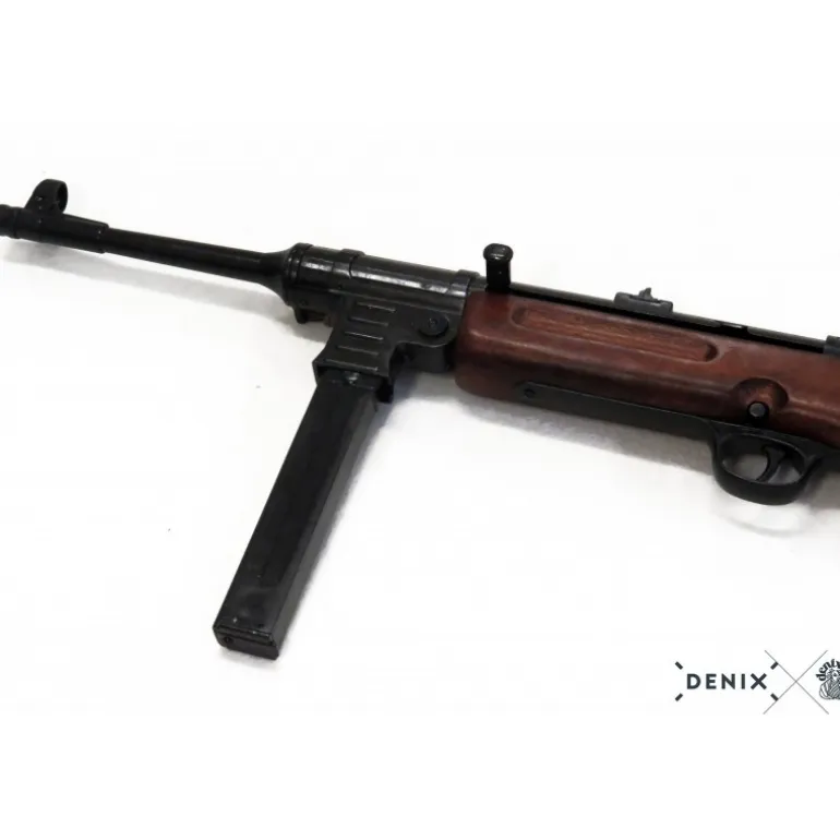 Sumérgete en la historia con esta exquisita réplica de la ametralladora MP41, una pieza icónica empleada durante la Segunda Guerra Mundial. Con una longitud de 86 cm y un peso de 3.235 g, esta réplica está diseñada a escala real, ofreciendo una reproducción detallada del modelo original alemán de 1940. Su estructura muestra un acabado en metal con partes de madera oscura que realzan su autenticidad. Destaca la presencia de una correa de piel marrón, proporcionando un aspecto clásico y elegante.