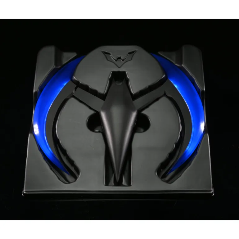 El Batarang, de aproximadamente 20 cm, cuenta con iluminación LED azul en las alas que se puede encender o apagar. Funciona con 3 pilas de botón que vienen incluidas.