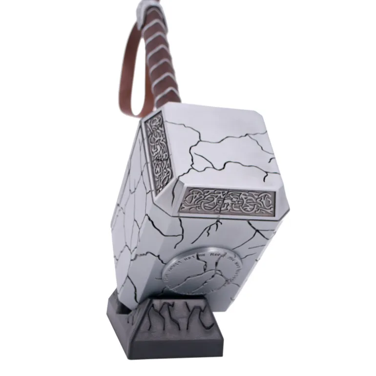 El martillo está hecho de acero de alta calidad, lo que le confiere durabilidad y un aspecto auténtico. Cuenta con un diseño detallado y cuenta con una función LED tanto en el martillo como en la base. El martillo ofrece tres posibilidades de función LED, lo que le brinda una experiencia visual impactante y dinámica. Con unas dimensiones de 45 cm x 23 cm x 13,5 cm. Viene acompañado de un soporte que te permite exhibirlo de manera elegante y segura en tu colección o en tu espacio preferido.