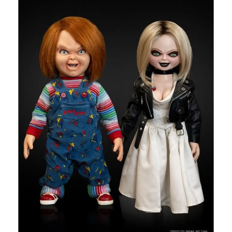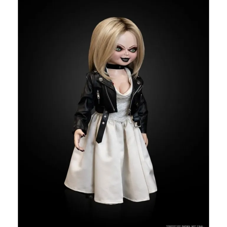 Descubre la réplica a tamaño real 1:1 de Tiffany, directamente de la serie Chucky. Esta muñeca «Good Gals» ha sido creada en colaboración con Alterian Inc. y Tony Gardner para ofrecer un detalle fiel a la pantalla. Con una altura de 66 cm, presenta una estructura articulada que permite variar sus posturas, ojos móviles, y una peluca de cabello real. Su chaqueta de cuero a medida y su vestido de novia completan su icónico look.