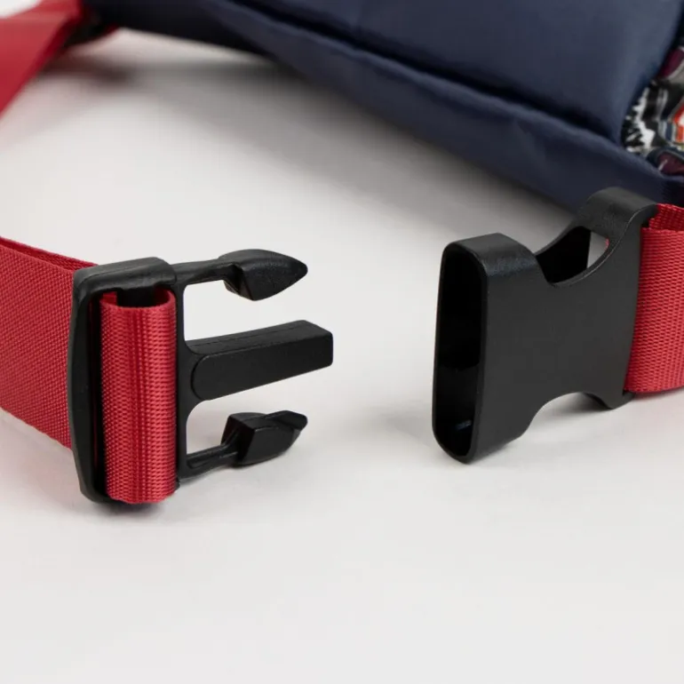 El diseño incluye una correa resistente de color rojo ajustable con un cierre de hebilla de plástico negro, proporcionando un ajuste seguro y cómodo. La parte trasera de la riñonera es de un azul oscuro liso, manteniendo un estilo sobrio y elegante.