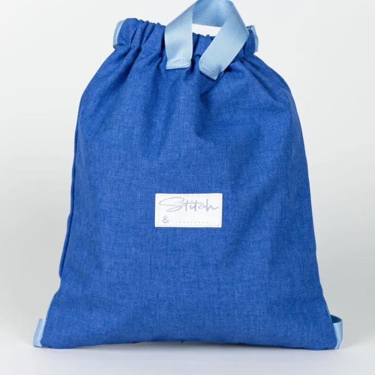 El saquito cuenta con un cierre de cordón ajustable que permite guardar libros, juguetes y otros accesorios de manera segura. Las asas de tono celeste proporcionan comodidad para llevarlo al hombro o en la mano. Además, tiene una etiqueta con el logo de «Stitch» que agrega un toque de autenticidad y moda.