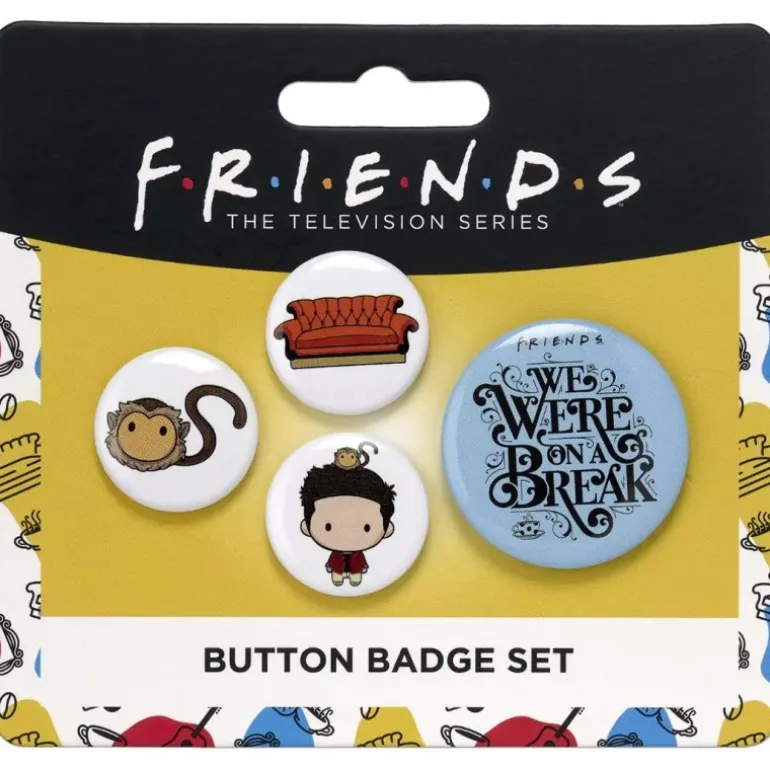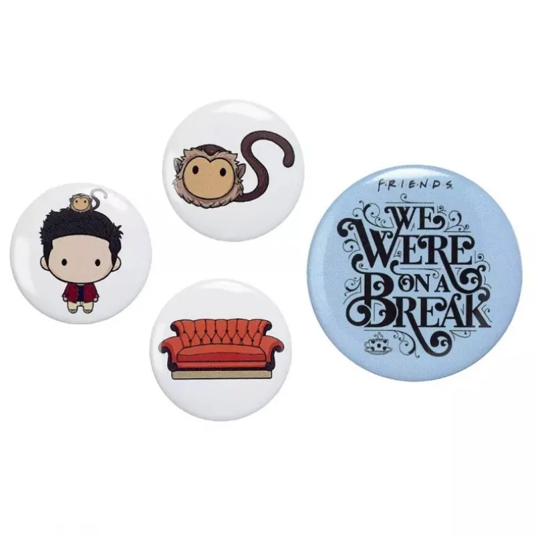 Descubre el set de 4 badges Ross – Friends, un imprescindible para los amantes de esta icónica serie. Este conjunto incluye cuatro distintivos únicos, cada uno con un diseño especial que hará las delicias de cualquier coleccionista o seguidor de FRIENDS. Los badges presentan personajes y elementos emblemáticos: uno muestra a Ross de manera adorable con un estilo chibi, acompañado por su inseparable mono Marcel sobre su cabeza. Otro badge rinde homenaje al famoso sofá del Central Perk, capturado en un vibrante color rojo que lo hace destacar. El tercer diseño presenta a Marcel, el mono, en un diseño encantador, mientras que el cuarto badge muestra la frase «We Were On A Break» sobre un fondo azul, una de las citas más memorables de Ross en la serie.