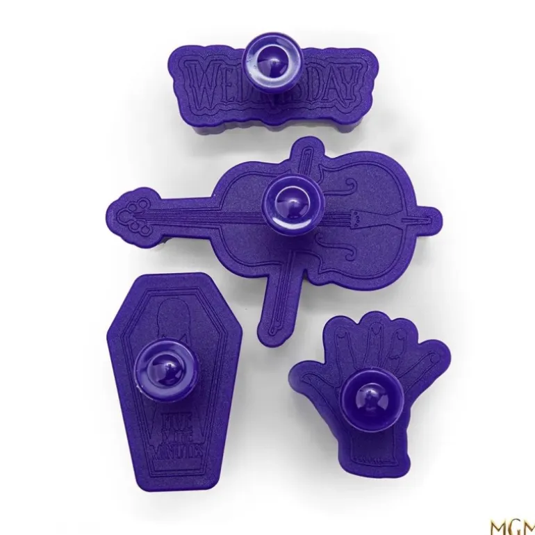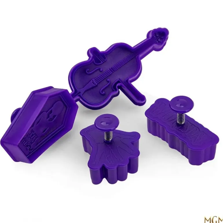 Sumérgete en el mundo oscuro y encantador de Miércoles Addams con este exclusivo set de 4 cortapastas. Cada pieza, de color púrpura brillante, está cuidadosamente diseñada para replicar iconos icónicos de la serie. Encontrarás formas de un violonchelo, una mano, un ataúd y el logo de Wednesday, todos detalladamente elaborados para añadir un toque especial a tus creaciones culinarias.