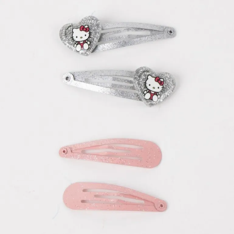 Además, el conjunto ofrece dos pinzas para el cabello en color plateado con brillo, cada una adornada con un encantador corazón de Hello Kitty en relieve. Estas pinzas no solo aseguran el cabello, sino que también añaden un toque de diversión y estilo. El set está diseñado para complementar cualquier atuendo y hacer que cada día sea especial para las niñas.