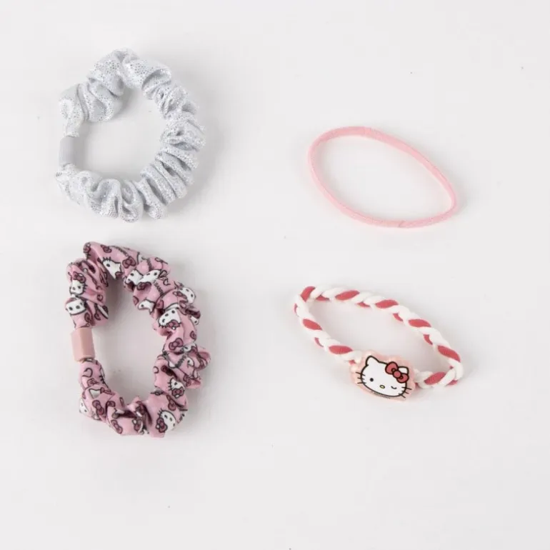 La colección cuenta con dos scrunchies, uno en color plateado brillante y otro decorado con un patrón de Hello Kitty sobre fondo rosa. También incluye una elástica rosa lisa y otra trenzada en blanco y rojo con un detalle de Hello Kitty.