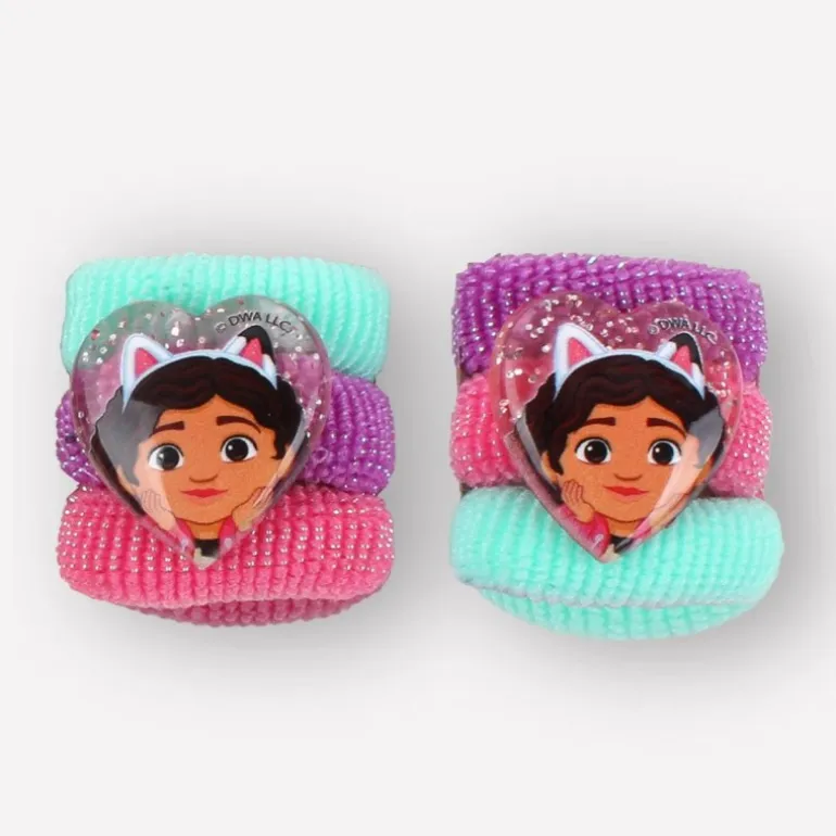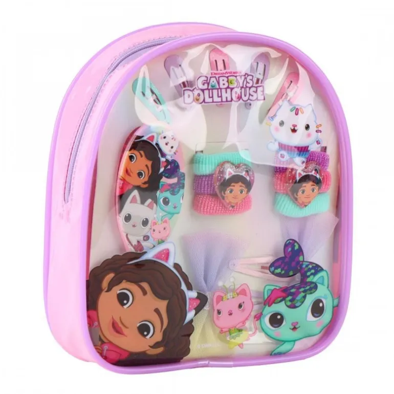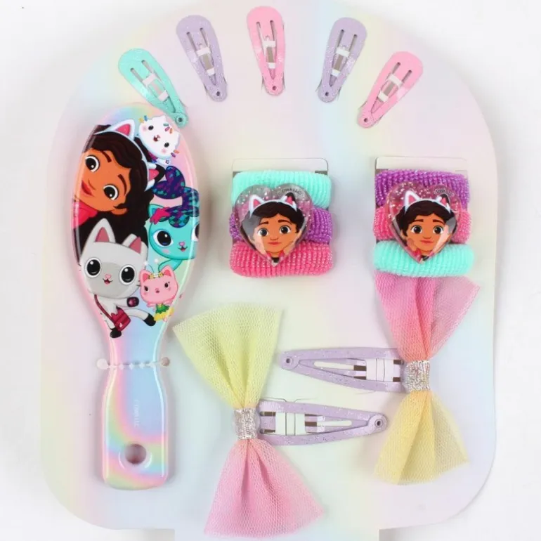 El set contiene un cepillo de cabello decorado con personajes coloridos, dos coleteros con la imagen de Gabby y sus amigos, y cinco pinzas de cabello en tonos pastel adornadas con purpurina. Además, dos pinzas decoradas con lazos de tul rosa y amarillo, añaden un toque de dulzura y diversión.