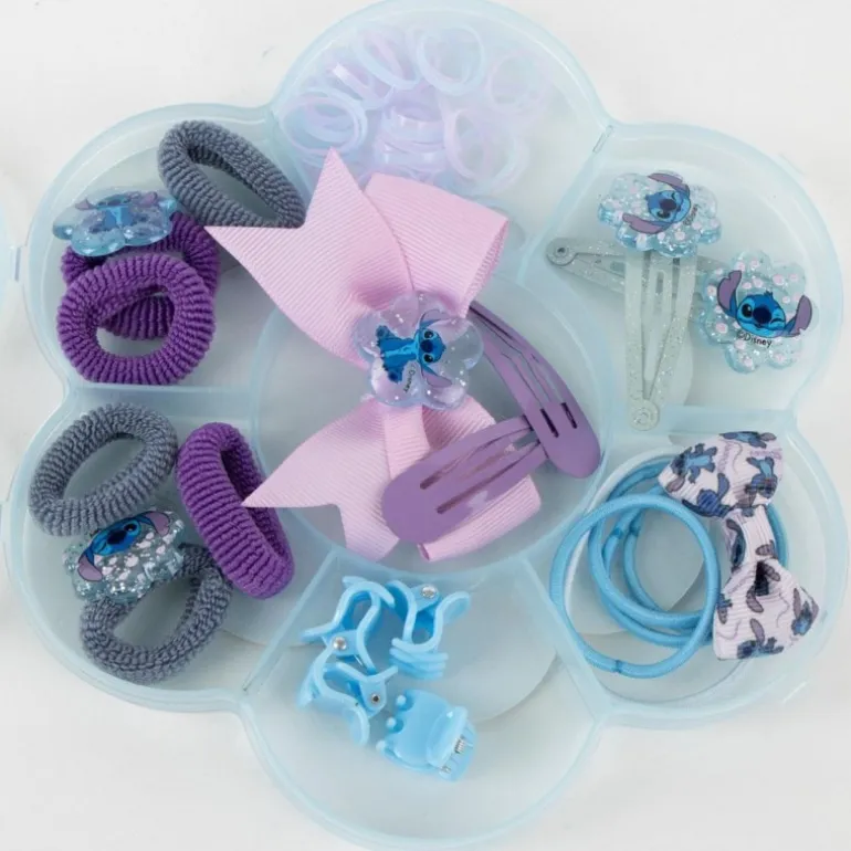 Incluye una variedad de accesorios como pinzas azules, cintas elásticas, lazos y horquillas decoradas con la imagen de Stitch, perfectas para crear peinados únicos. Fabricados con materiales de alta calidad, estos accesorios son resistentes y seguros para los niños.