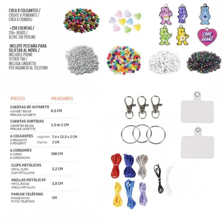 Además, el set trae 6 colgantes con figuras de los Care Bears, clips metálicos y anillas para asegurar tus creaciones. También incorpora un parche para sujetar al móvil, permitiéndote llevar tus diseños a donde vayas. Todo está presentado en una caja colorida y atractiva, perfecta para regalar.