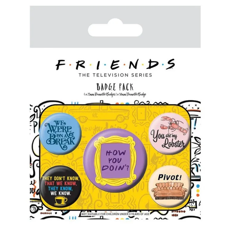 Un pack de 5 chapas con licencia oficial, cuyo diseño es un homenaje a una de las comedias televisivas más icónicas de los años 90, Friends.