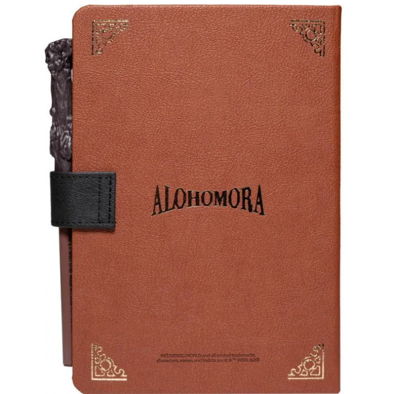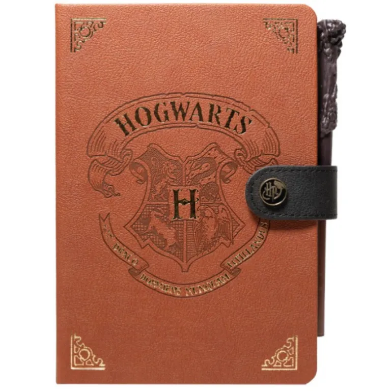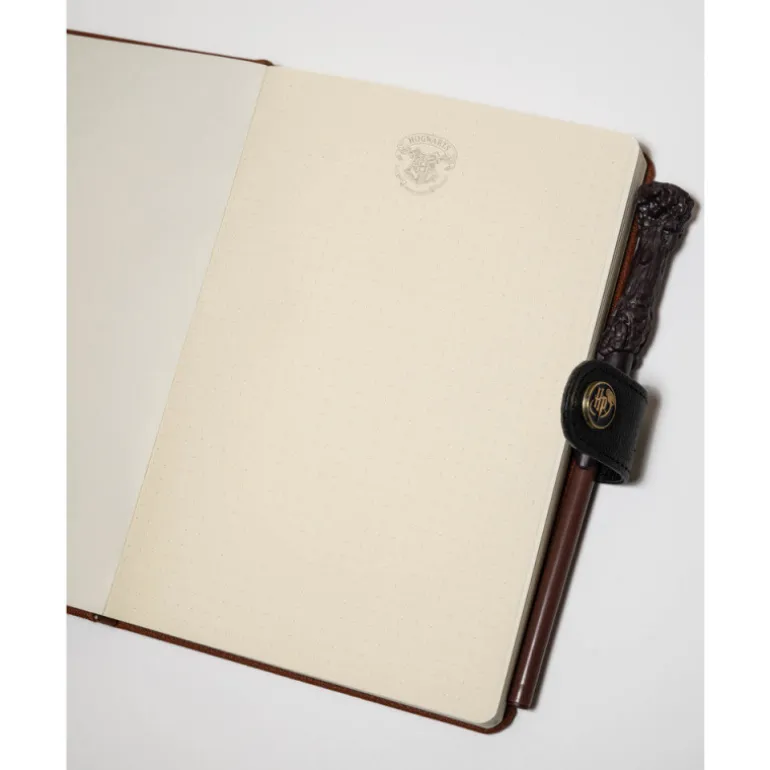 Se trata de un fantástico bolígrafo que reproduce perfectamente la forma de la varita de Harry, con todos sus detallitos de la varita original. Con este boli cualquier cosa que escribas o dibujes, tendrá el toque de magia definitivo. Y no te pierdas la elegante libreta tamaño A5, con las portadas en cuero sintético y el escudo de Hogwarts con todos los detallitos del original reproducidos a la perfección, en color dorado sobre marrón.