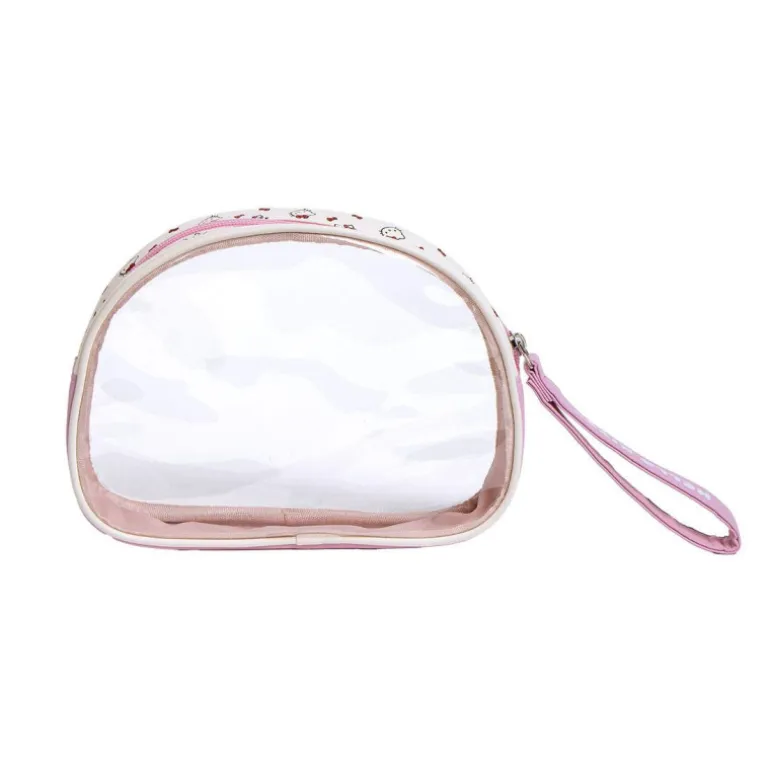 El neceser exterior es de un suave color rosa con un acabado transparente, lo que te permite ver fácilmente lo que hay dentro. El cierre con cremallera es seguro y está adornado con un bonito patrón de pequeños dibujos de Hello Kitty en la parte superior. La correa lateral, también en rosa, está marcada con el nombre de Hello Kitty, añadiendo un toque único y personal.