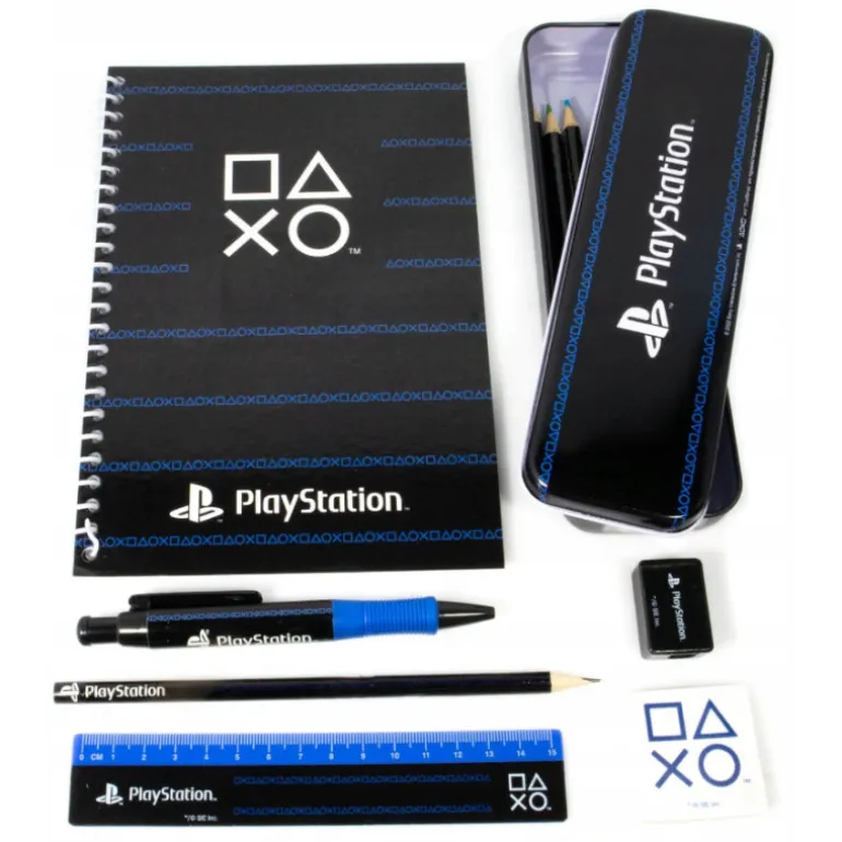 El set contiene un cuaderno A5, una regla, 4 lápices de colores, un bolígrafo, un lápiz, un sacapuntas y un estuche. Con las imagenes de los símbolos del mando de la PlayStation en tonos blanco y negro. Bueno, todo lo que se ve en la foto.