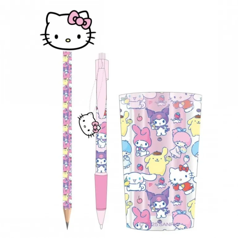 Descubre este encantador set de papelería de Hello Kitty, perfecto para los amantes de este icónico personaje. El set incluye un portalápices cilíndrico decorado con adorables ilustraciones de Hello Kitty y sus amigos, en un vibrante diseño multicolor. Dentro encontrarás un lápiz decorado con un adorno de Hello Kitty, un bolígrafo con llavero temático, y una regla a juego. Todo está cuidadosamente empaquetado en una caja de presentación que resalta el estilo único de Hello Kitty. Ideal para añadir un toque de diversión a tu escritorio escolar o de oficina.