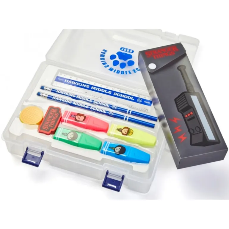 Un set de papelería que incluye dos lapiceros, una goma, un sacapuntas, una pequeña regla y cuatro marcadores. Todo ello con un diseño fantástico, con la imagen del Instituto Hawkins, al que acuden los protagonistas de la serie, pero también con dibujos de personajes tan queridos como Will, Dustin o Mike… Y no te pierdas la goma con el inconfundible logo de la serie y el sacapuntas con la forma de esos Eggo’s que tanto le gustan a Eleven. Y todo ello viene en un maletín transparente muy cuqui.