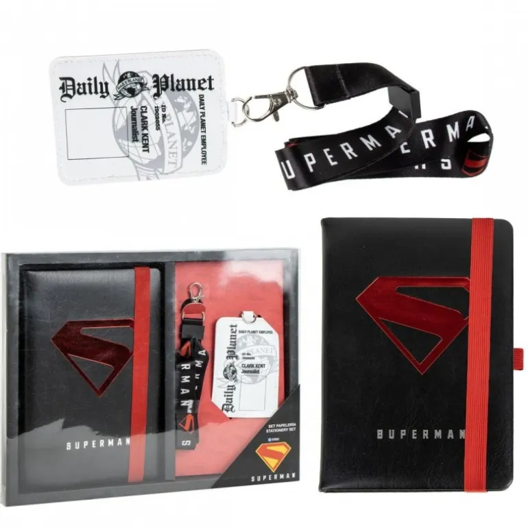 Descubre el Set de Papelería Superman, un conjunto imprescindible para los fans del superhéroe más icónico. Este set incluye un elegante cuaderno de tapa dura en color negro con el emblemático logo de Superman en rojo metalizado. El cuaderno, asegurado con una banda elástica roja, es ideal para tomar notas importantes. Además, el set presenta una tarjeta de identificación del Daily Planet, perfecta para añadir un toque de realismo a tu colección. Completa este kit un práctico lanyard negro con el logo de Superman en rojo, ideal para llevar la tarjeta de identificación, llaves u otros accesorios. Este conjunto es perfecto para uso personal o como regalo para cualquier amante de los cómics.