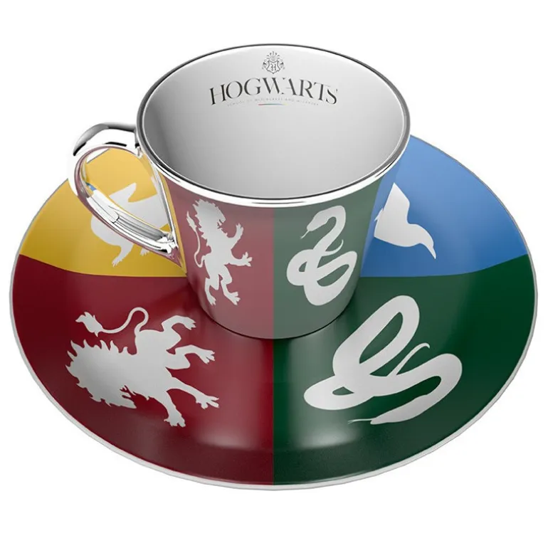 Se trata de una tacita de café, con su platito, que es una auténtica monada, con un diseño que es una maravilla, homenaje al mítico colegio de magia y hechicería Hogwarts, con los emblemas de las cuatro casas que lo integran: Gryffindor, Hufflepuff, Ravenclaw y Slytherin, que aparecen en el plato. La tacita de café tiene unos acabados brillantes plateados, el exterior tipo espejo y en su interior aparece el nombre de Hogwarts.