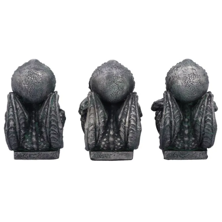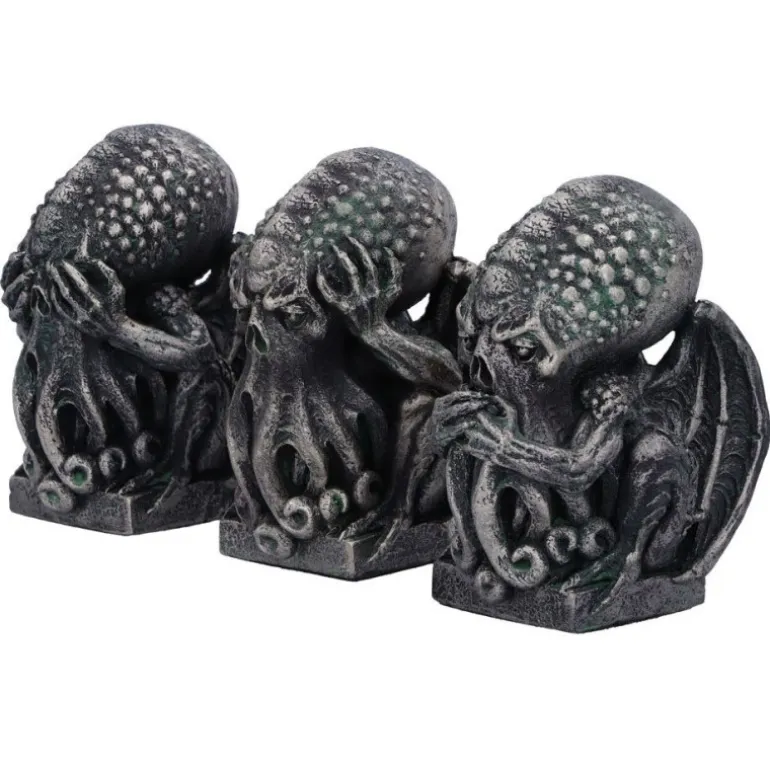 Se trata de set de tres figuras de 7 cm fabricada en poliresina, con un montón de detalles y un trabajo de pintura a mano espectacular, que nos muestra a este antiguo dios con esa intrincada forma mezcla de pulpo, dragón y humanoide. Es una escultura excepciona con extraordinarios detalles para que el realismo sea total. Con Cthulhu con diferentes expresiones.